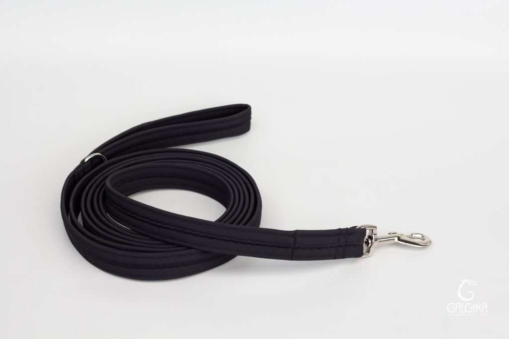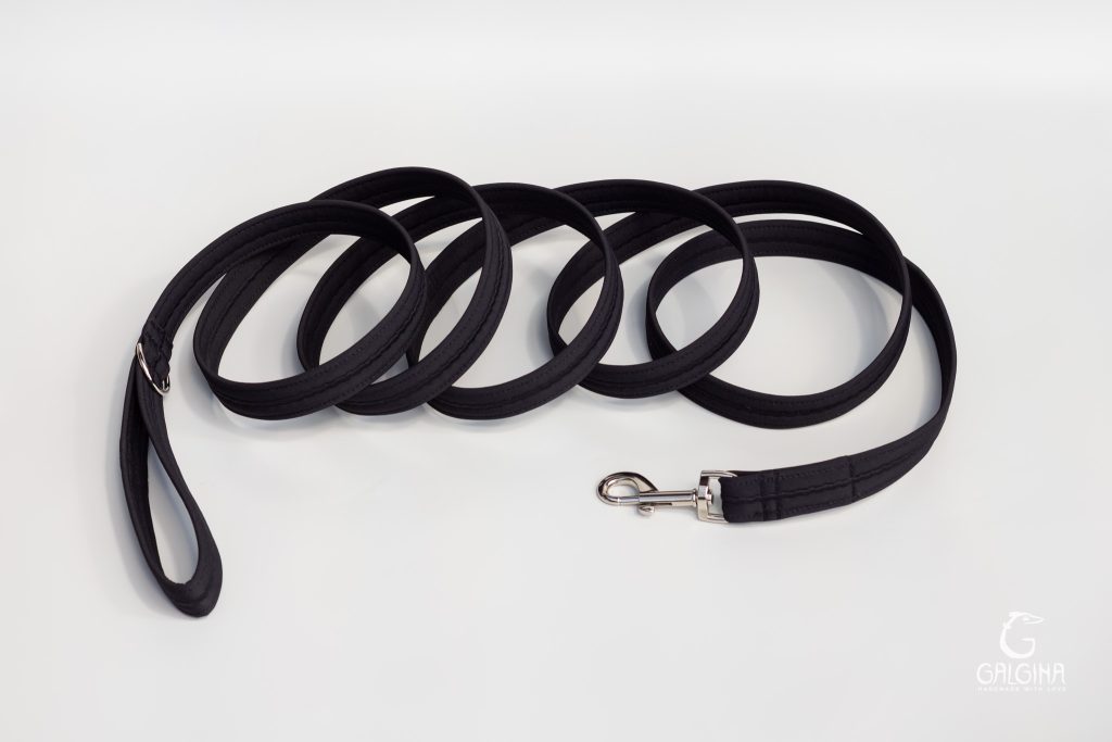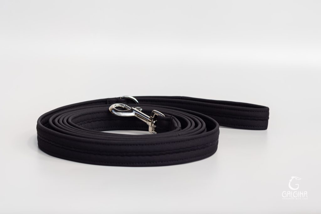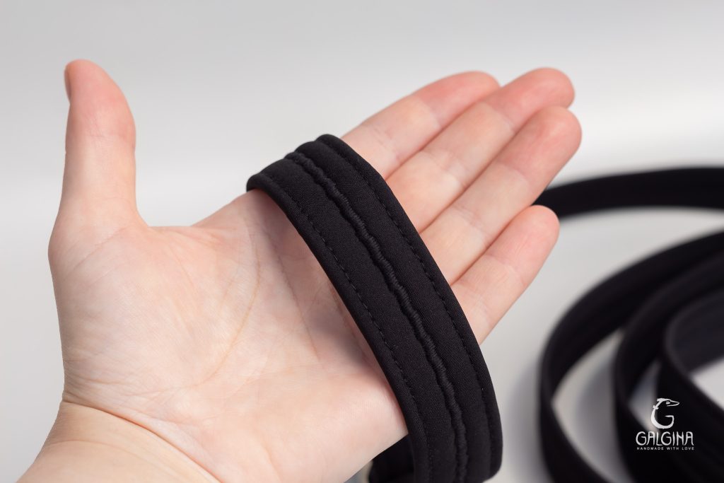 The long softshell leash is the longest model in our range, measuring 3 meters. It is made from a flat nylon strap wrapped in softshell fabric, which is a durable, water-repellent, easy to maintain, and quick-drying material. The leash is soft, smooth, and has a cushioned feel. Due to the rounded edges that do not cut into the hands, it is comfortable to handle. The leash features an embroidered seam along the middle of the strap, which gives it a matching look with the harnesses.