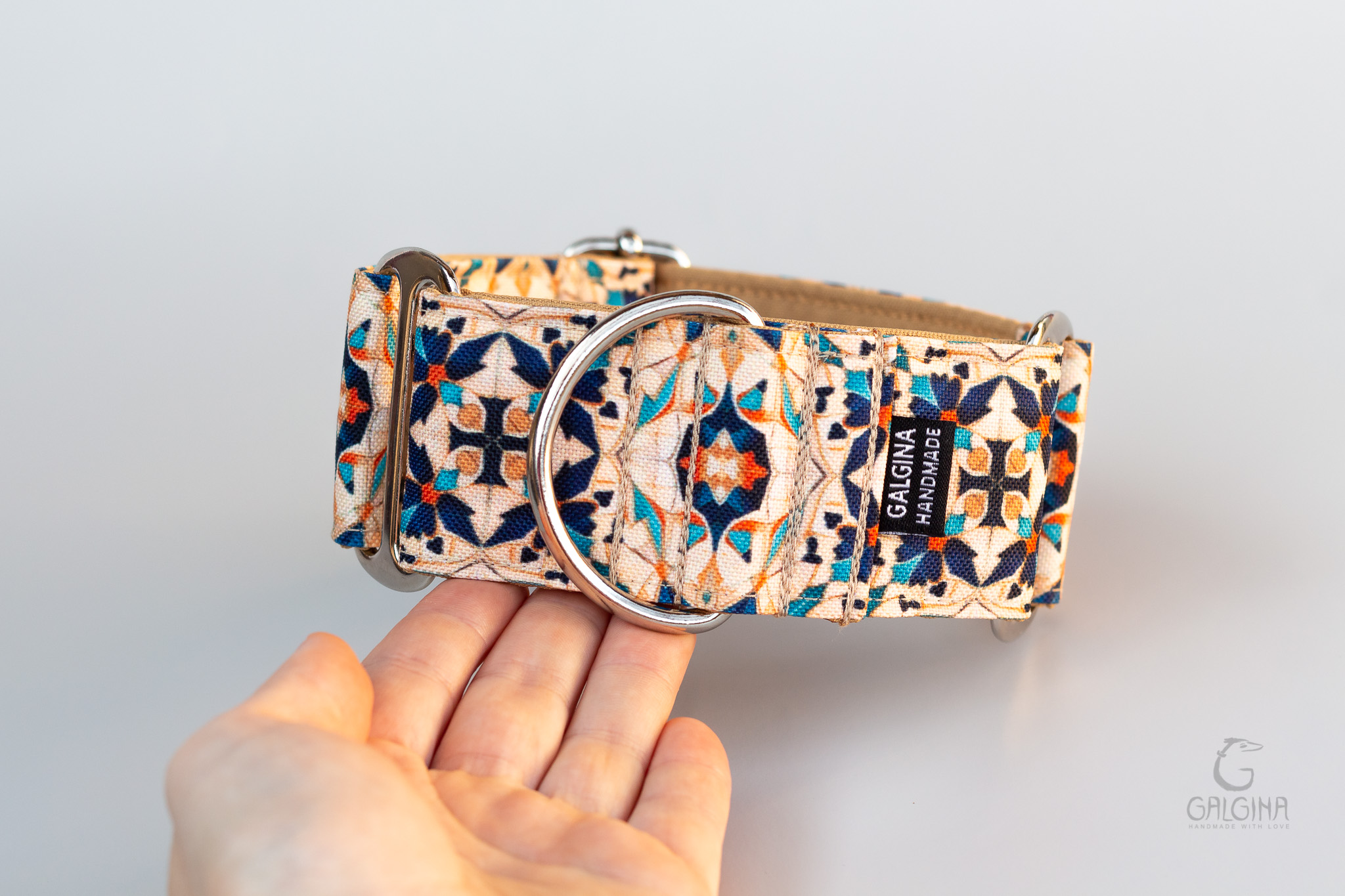 Collars in Persia design are smooth, medium-thick, and a bit rigid, but the size adjusting is easy. The decorative fabric repels water (is not 100 % waterproof), and does not get soggy, that’s why collars dry faster. Being relatively durable, these collars are suitable for moderate to everyday wear. The water repellency of the decorative fabric decreases with washing and the colors of printed materials can fade over time, especially if exposed to direct sunlight, water, and rubbing. Collars are available in different types and widths, the design is shown on a 5 cm wide martingale collar.